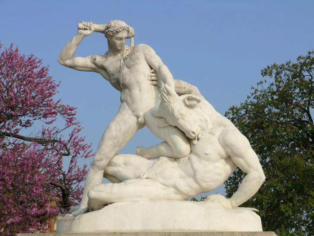 Les habitants d'Athènes devaient souvent livrer 7 garçons et 7 filles à Minos, le roi de Crète qui les donnaient à manger au minotaure un monstre mi-homme mi-taureau qui était enfermé dans un labyrinthe construit par Déadale, un architecte. Thésée, fils du roi Egée d'Athènes embarqua avec les gens qui devaient être livrer au monstre. Pour ne pas se perdre dans le labyrinthe, Ariane, fille de Minos tenait à l'extérieur l'autre bout d'une pelote de laine et au fur et à mesure que Thésée avancait avec la pelote se déroulait. Arrivé dans la caserne du minotaure, il le tue en l'égorgant et couru en suivant le fil, prévint ses camarades et elmbarqua avec Ariane pour la Grèce. Mais à l'approche du port, il oublia de mettre les voiles blanches qui devaient prévenir son père de son retour donc quand Egée vit le navire sans les voiles blanches, fou de douleur et de chagrin, il se jetta dans la mer qui depuis porte son nom (mer Egée).