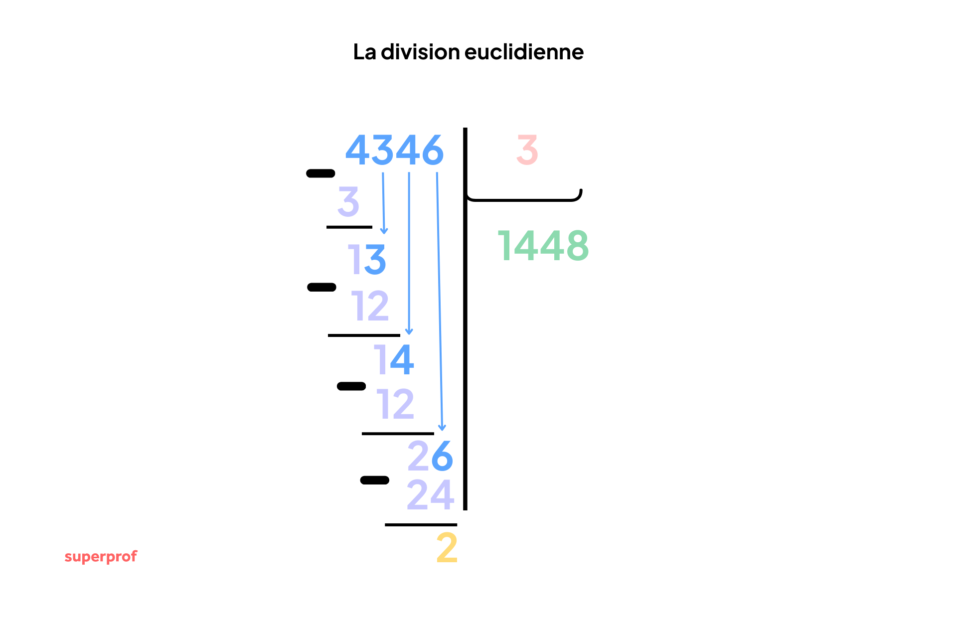 Reprenons notre calcul précédent : 4346/3. Nous avions trouvé un quotient de 1448 et un reste de 2.
