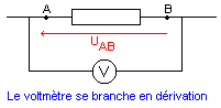 La tension électrique est une grandeur que l'on mesure à l'aide d'un voltmètre; elle s'exprime en volts (V). Le voltmètre se branche en dérivation. La tension électrique existant entre deux points A et B est notée UAB.