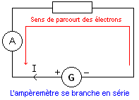 L'intensité du courant électrique se mesure à l'aide d'un ampèremètre, elle s'exprime en ampères (A). L'ampèremètre se branche en série.