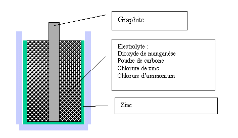 - d'une cathode constituée d'un bâton de graphite poreux entouré de dioxyde de manganèse, un oxydant non conducteur.