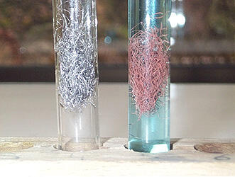 - Le dépôt métallique rouge-brun sur la paille de fer est identifié comme étant un dépôt de cuivre métallique.