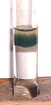 - La solution incolore est filtrée puis traitée avec une solution aqueuse d'hydroxyde de sodium. Il apparaît un précipité vert d'hydroxyde de fer (II) (voir photographie).