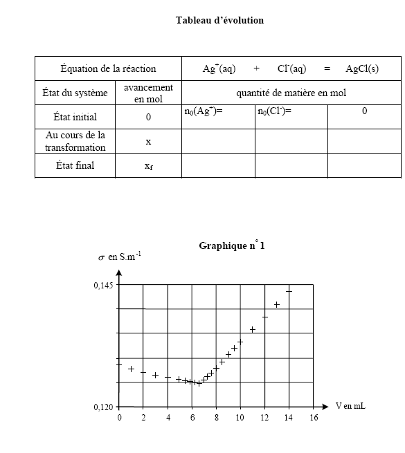 Cl-(aq). On introduit une sonde conductimétrique dans ce bécher et, tout en agitant la solution, on note sa conductivité lors de l’ajout de la même solution titrante de nitrate d’argent qu’au 1.2 : solution aqueuse de nitrate d’argent de concentration molaire en soluté apporté c = 0,080 mol.L-1. On obtient les points expérimentaux reportés sur le graphique n°1 de l’annexe, à rendre avec la copie.