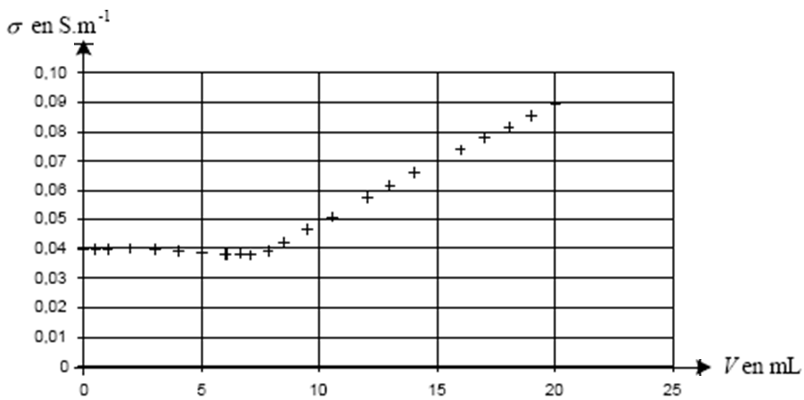1.2. Dans le volume V0 de la solution aqueuse de chlorure de potassium, on ajoute goutte à goutte une solution aqueuse de nitrate d’argent de concentration molaire en soluté apporté c = 0,080 mol.L-1. On note la valeur de la conductivité σ en fonction du volume V de solution de nitrate d’argent ajouté et on représente graphiquement σ en fonction de V. On obtient les points expérimentaux reportés sur le graphique ci-dessous :