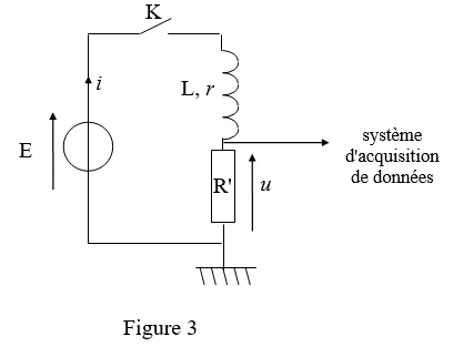 La bobine est maintenant montée en série avec une résistance R' = 100 W aux bornes d'un générateur idéal de tension de f.e.m. E = 6,5 V (figure 3).
