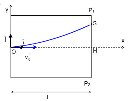 L'étude suivante porte sur le mouvement d'un électron du faisceau qui pénètre entre deux plaques parallèles et horizontales P1 et P2, dans une zone où règne un champ électrique E supposé uniforme et perpendiculaire aux deux plaques.