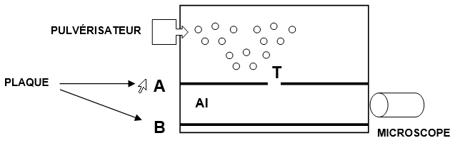 Un pulvérisateur produit un nuage de gouttelettes d'huile chargées négativement qui tombent dans la chambre supérieure du dispositif. Lorsque l'une d'elles passe à travers le trou T, elle tombe verticalement à une vitesse constante v1, son poids étant très vite compensé par la force de frottement exercée par l'air. Lors de cette première étape, la chute verticale de la gouttelette dans l'air en l'absence de champ électrique est observée à l'aide d'un microscope et permet de déterminer le rayon r de la gouttelette qui n'est pas mesurable directement.