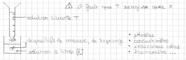 La réaction chimique utilisée fait intervenir l'espèce X comme réactif et une autre espèce T (dite titrante) choisie pour remplir les conditions suivantes :