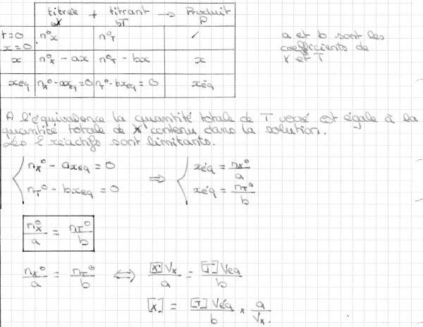 _ 2ème phase : l'équivalence, pour un certain volume de solution T versé, les réactifs T et X sont entièrement consommés( les deux sont limitants). La solution ne contient plus de X ni de T. Le volume versé est alors supposé volume équivalent Véq.