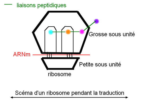 - Phase d'initiation : Les deux sous unités du ribosome s'assemblent sur l'ARNm au niveau du codon initiateur AUG.