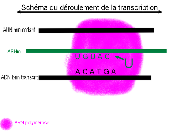 - L'ARN polymérase va assembler les nucléotides précurseurs par complémentarité : A <-> U C <-> G à partir du brin transcrit.