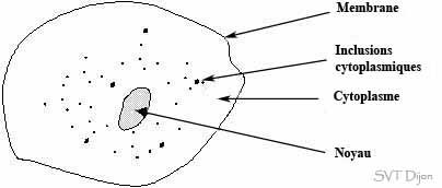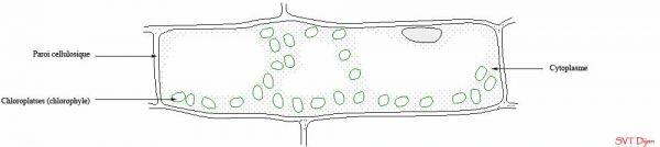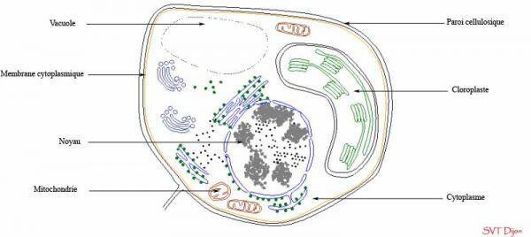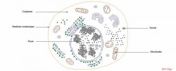 Les cellules animales et végétales ont en commun : - un noyau - un cytoplasme - une membrane cytoplasmique. Les cellules végétales ont en particulier : - une paroi cellulosique qui les entoure - une vacuole de grande taille - dans leur cytoplasme se trouvent des chloroplastes. Dans le cytoplasme se trouvent différents autres organites : - les mitochondries - les ribisomes - le réticulum endoplasmique. Rôle des différents éléments de la cellule : Le noyau contient l'information génétique et commande le fonctionnement de la cellule. La mitochondrie assure la production d'énergie pour la cellule à partir d'oxygène et de nutriments. Le ribisome est le lieu de fabrication des protéines. Le chloroplaste est le siège de la photosynthèse : fabrication de matière organique à partir du CO2 (dioxyde de carbone).