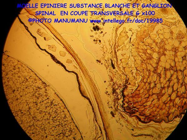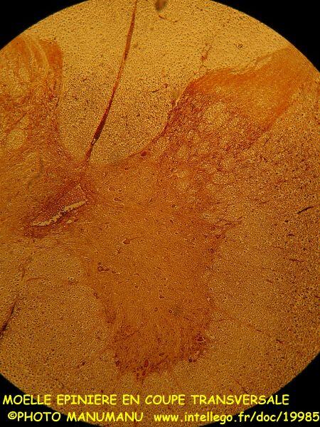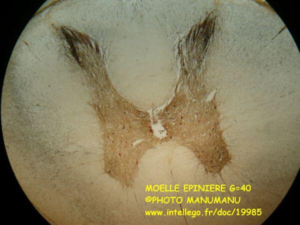 on voit bien sur cette coupe transversale au faible gorssissement (x40) les méninges, les cornes postérieures/supérieures et les cornes antérieures/inférieures de la substance grise enveloppée dans la substance blanche, le canal central de l'épendyme qui véhicule le liquide céphalorachidien
