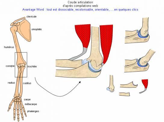 Voici un schéma représentant le membre antérieur. Outre les trois os humérus, radius et cubitus sont figurés les deux muscles antagonistes, le biceps fléchisseur de l'avant-bras et le triceps extenseur. Ainsi que la structure détaillée du coude.