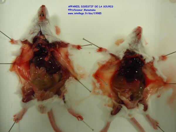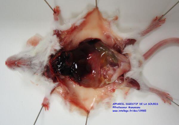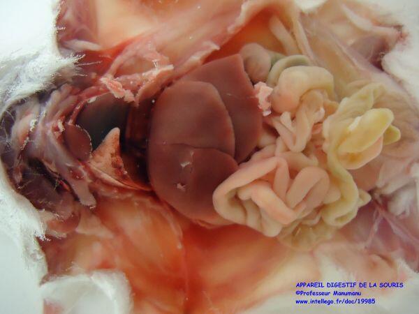 Après dissection de la paroi abdominale apparaissent tous les organes de l'abdomen avec le foie rouge foncé surmontant l'appareil digestif.