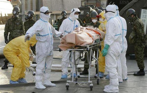 Une personne susceptible d’avoir été irradiée est évacuée vers le centre de traitement de Nihonmatsu, dans la préfecture de Fukushima.