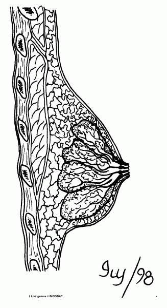 Ce schéma représente la structure du sein de la femme ou glande mammaire vu de profil