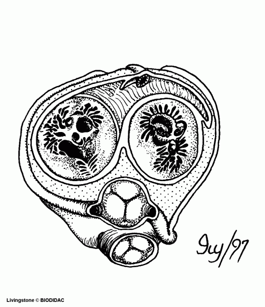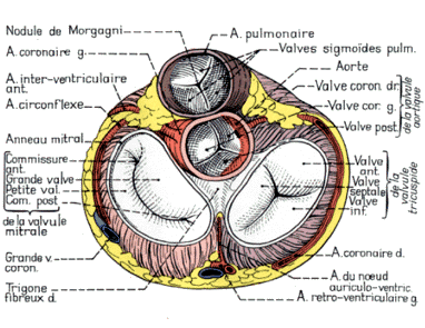 Sur le schéma, on reconnaîtra facilement les valvules : la tricuspide à trois valves (sigle Mercedes), la mitrale de l'autre côté, la valvule aortique plein centre